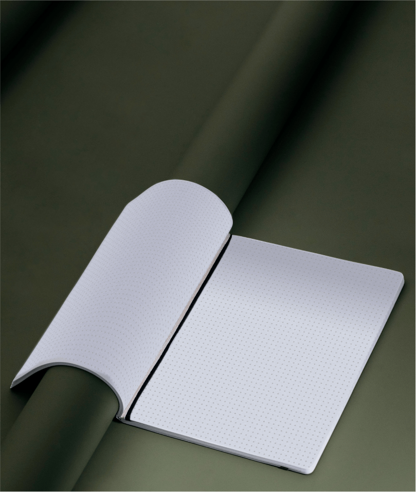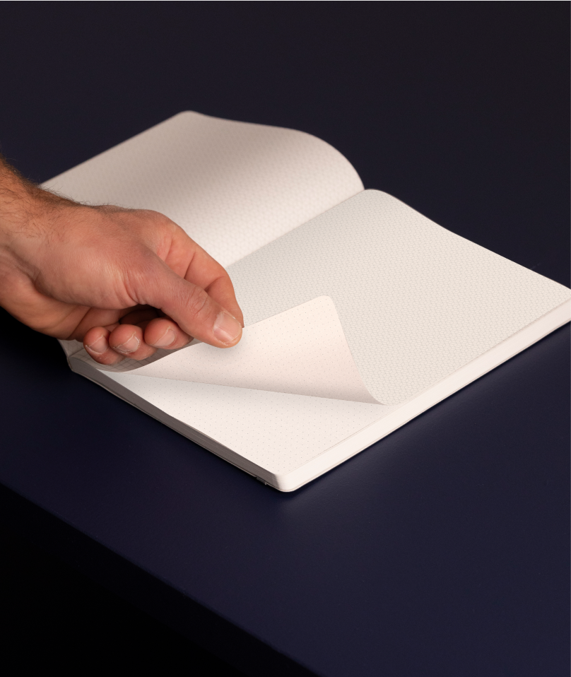 Debossed grey softcover - a subtle nod to the technical grids inside, helping you spot this notebook instantly on any workspace.